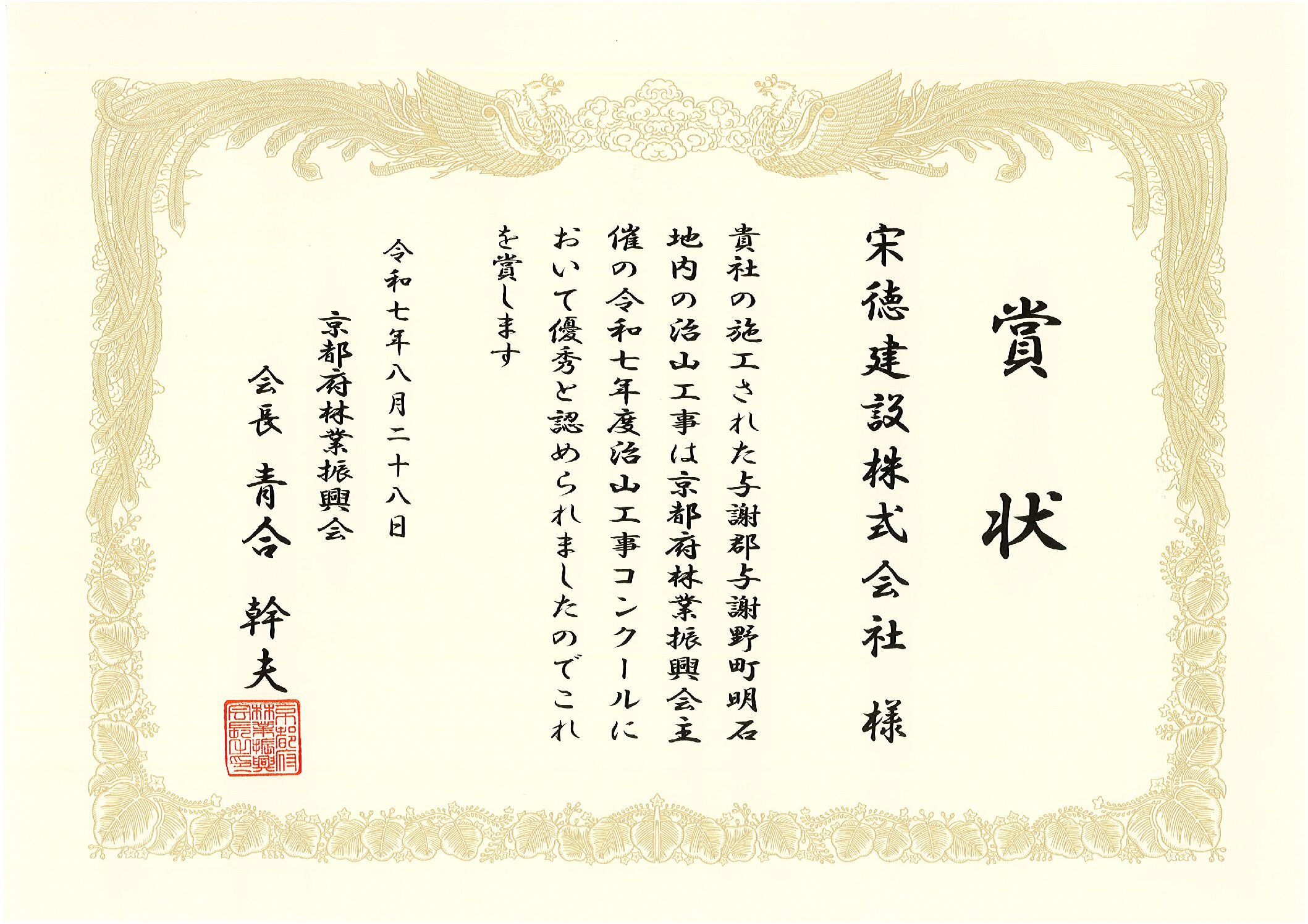 令和7年度治山工事コンクールにて、「京都府林業振興会長賞」を受賞しました。