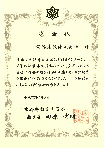 京都府丹後土木事務所から管内一円(宮津養父線)美しい京都公共施設整備工事において優秀賞の表彰を受けました。